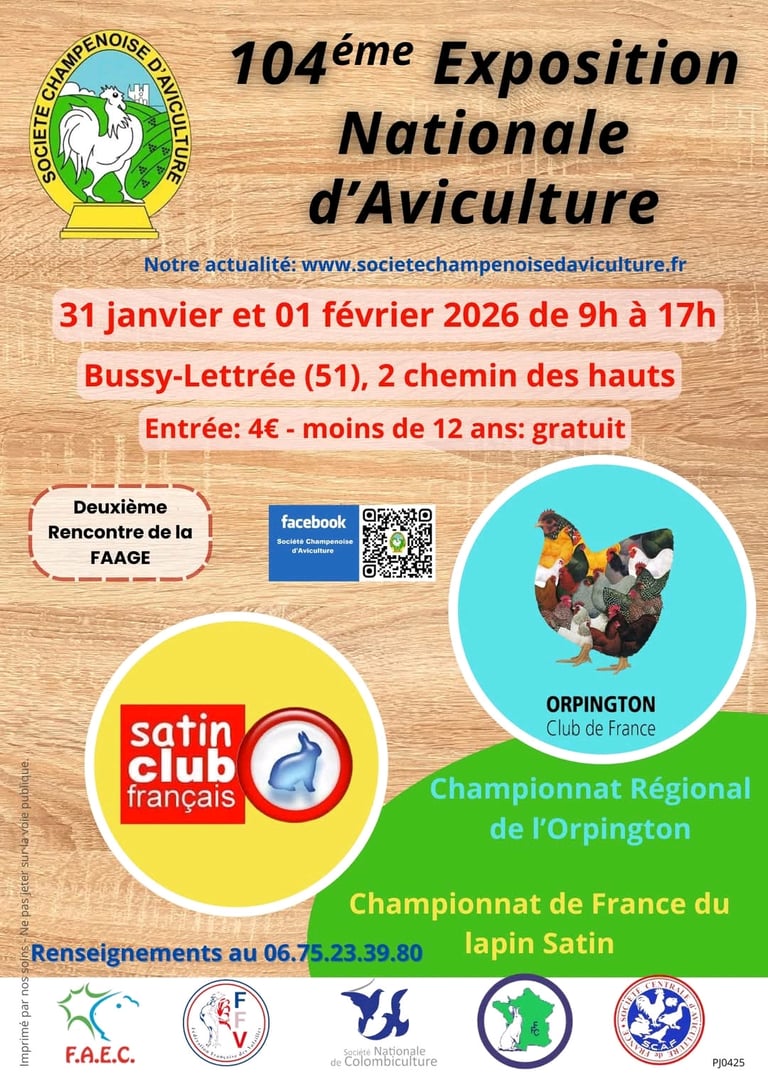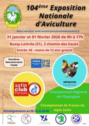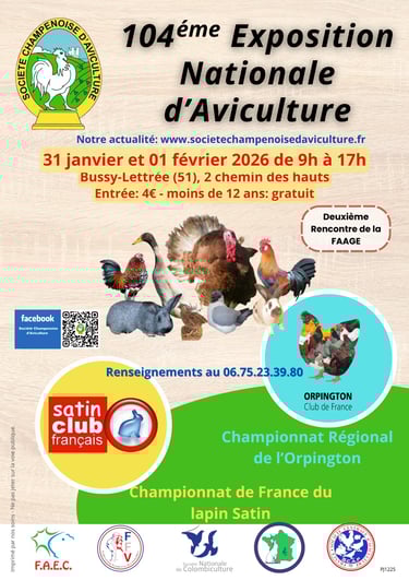 Deux championnats viendront enrichir l’événement : celui des poules Orpington, organisé par le Club Orpington France, ainsi que celui des lapins, porté par le Satin Club France.