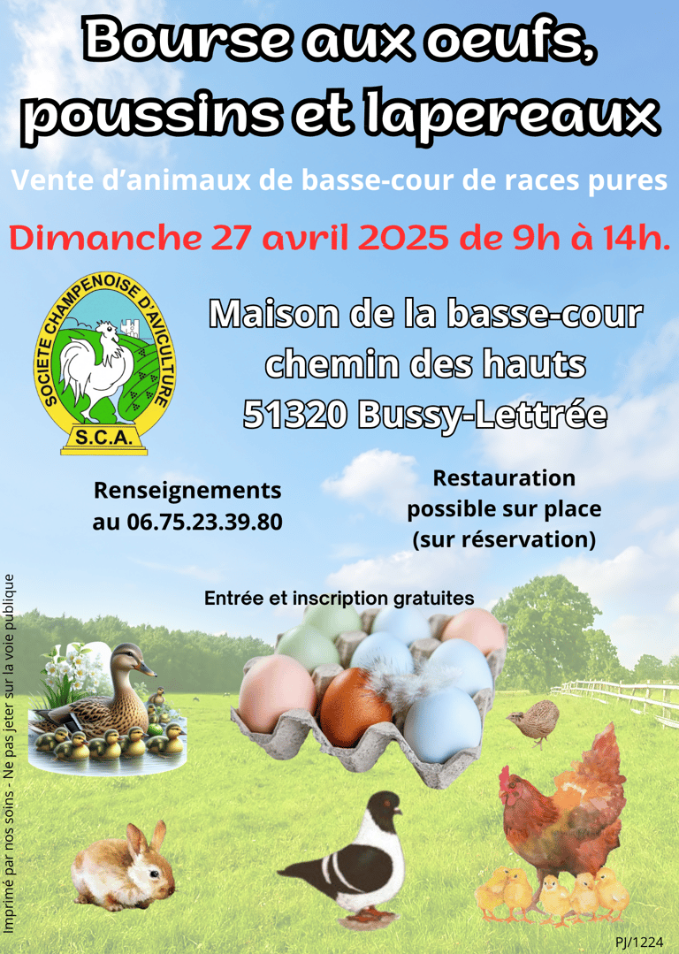 Poussins de différentes races de volailles, œufs à couver et lapereaux seront mis en vente.
